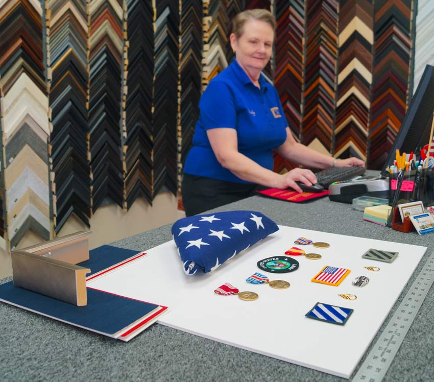 The Objective Imaginative Framer will not intimidate their customers with biases. In this example the unbiased framer with imagination creates a flag shadow box that is part of a retirement gift package for a client.